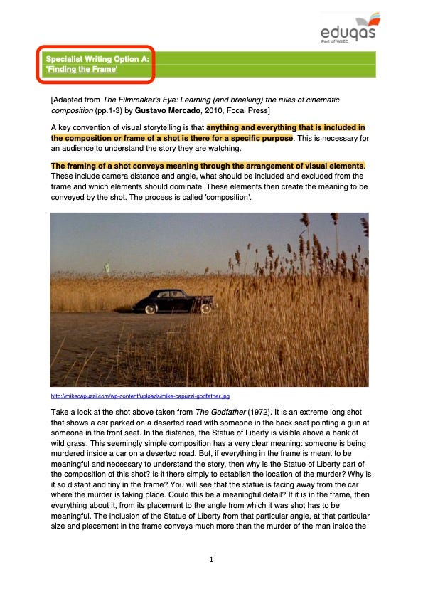 The framing of a shot conveys meaning through the arrangement of visual element, this includes distance and angle. These elements create the meaning to be conveyed by the shot, this process is called “composition”.